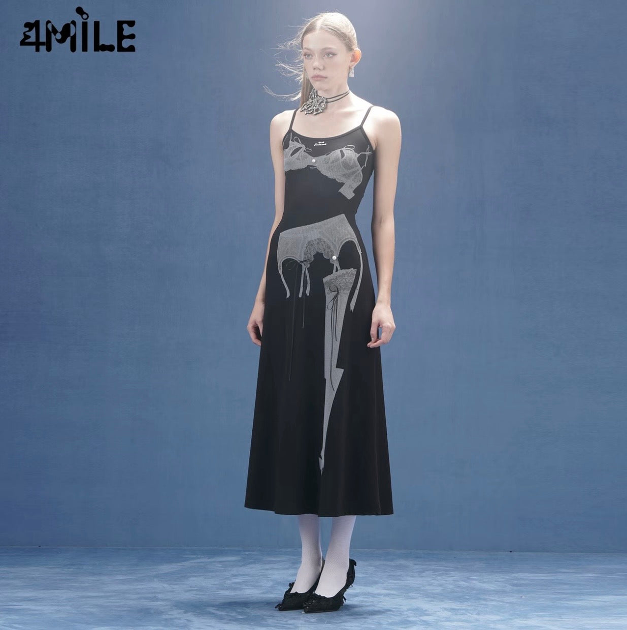 4MILE 2024 Spring/Summer New Lace Sexy Print Slim Fit Spaghetti Strap Long Dress - Stylish Design, Waist-cinching, Slimming, Hot Girl Style
