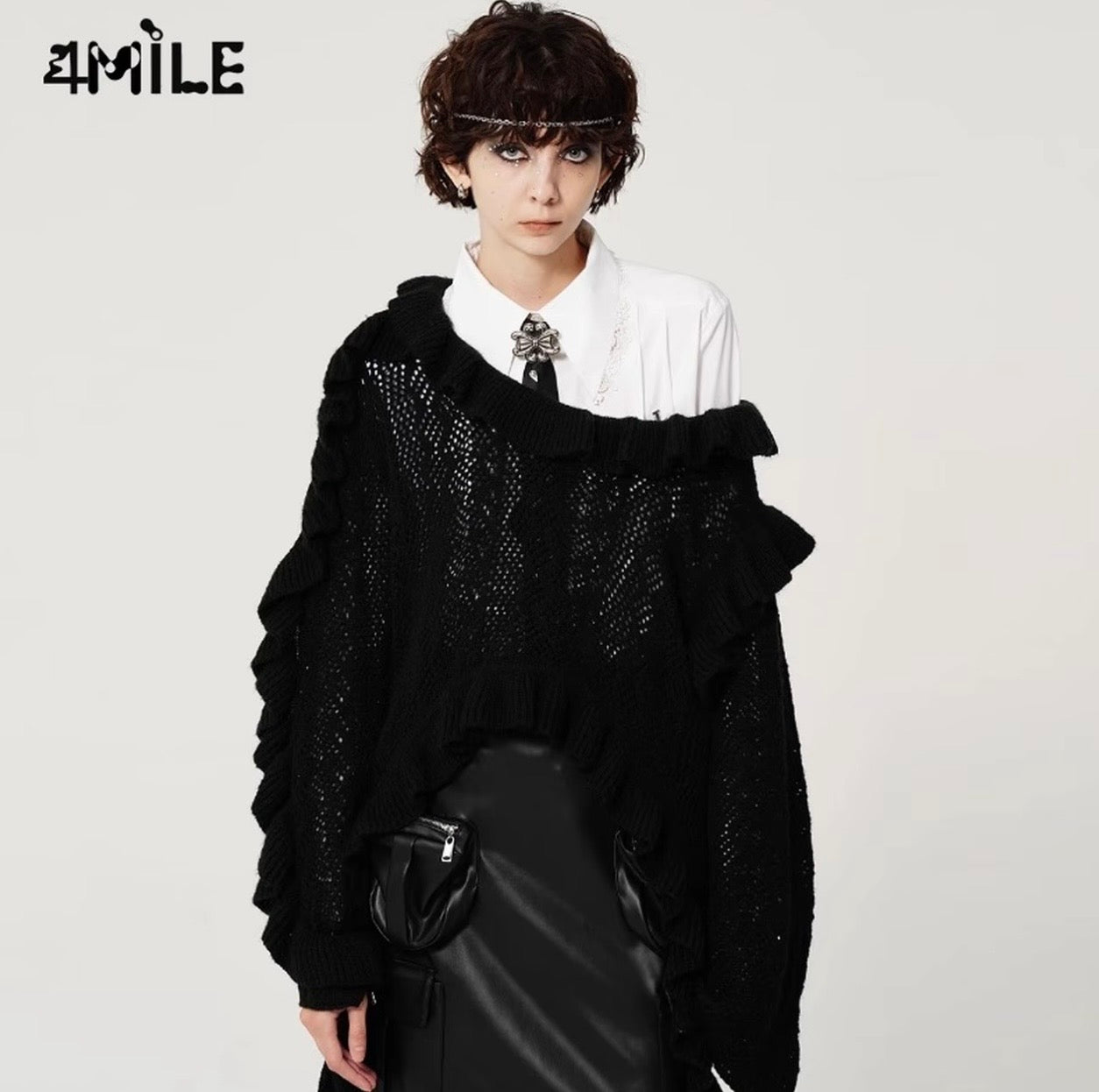 4MILE不规则设计感荷叶边抽皱花边飘带套头网眼镂空长袖针织衫