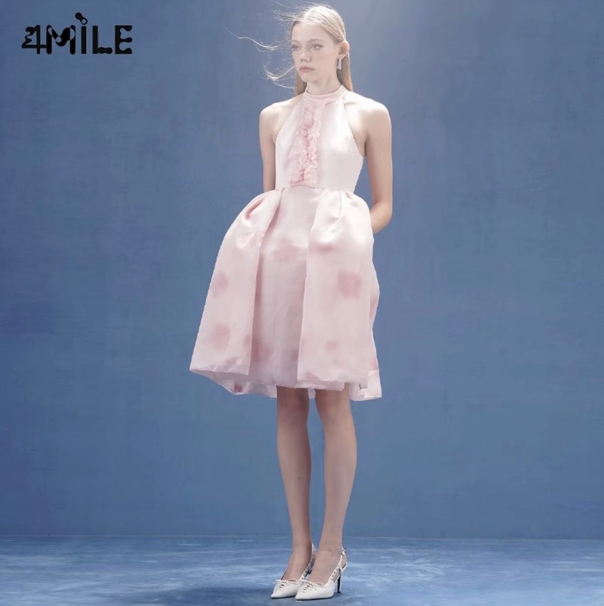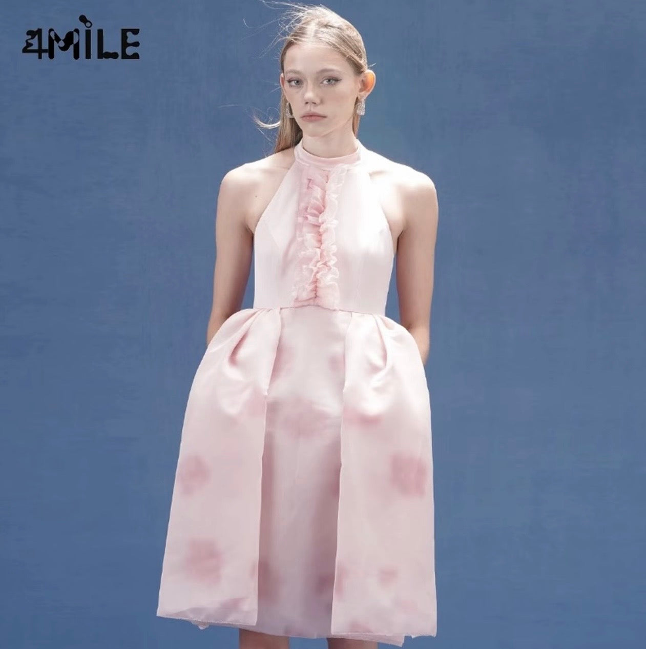 4MILE春夏新款粉色抽皱花边挂脖连衣裙优雅气质设计师高订礼服