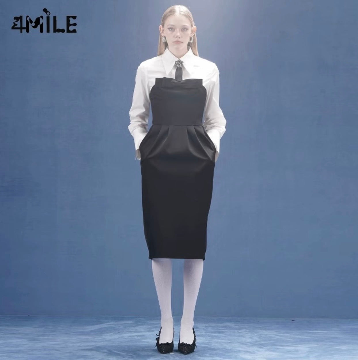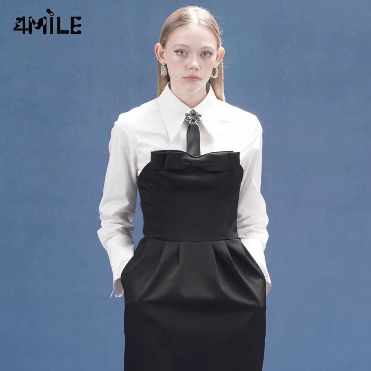 4MILE春夏新款黑色蝴蝶结茧型抹胸连衣裙气质收腰显瘦中长裙